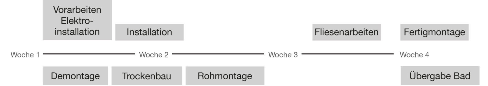 - Alles inklusive – von Badplanung und Sanitärleistung über Trockenbau, Elektro, Lichtgestaltung, Fliesen, Innenausbau und Malerarbeiten bis Raumausstattung und Endreinigung